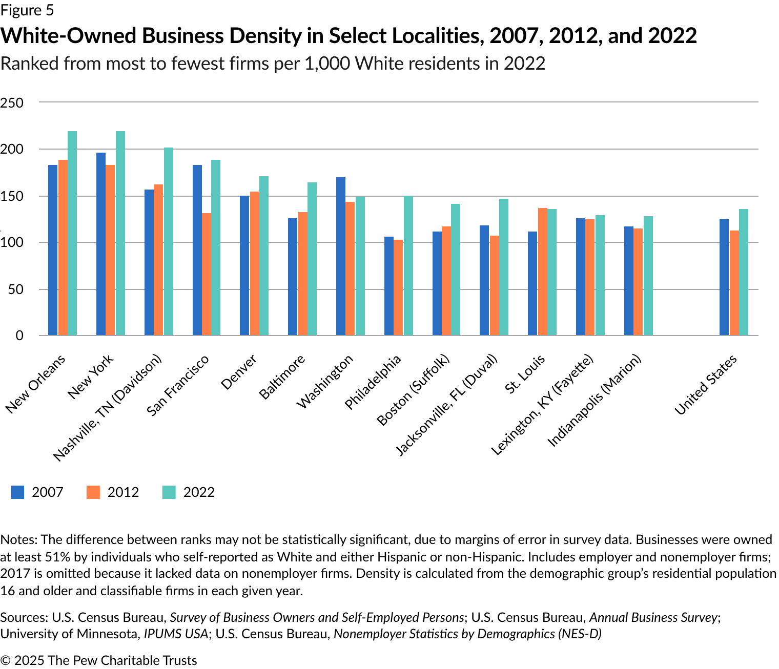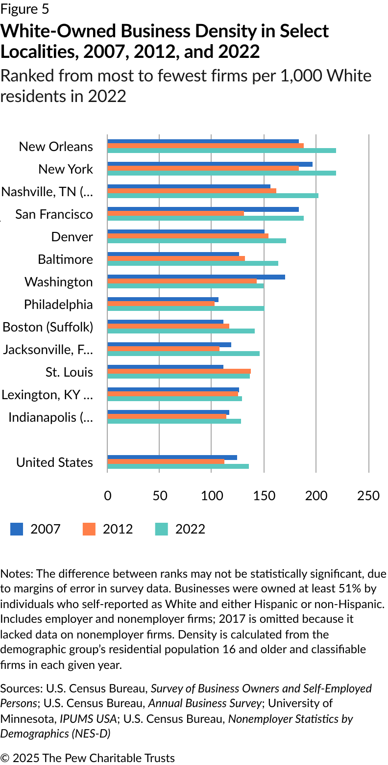 There are many possible reasons why localities’ business density would differ, although it was beyond the scope of this report to pinpoint the role of each factor statistically. More research is needed into the reasons, which could include differences in the industry mix between localities or because some sectors—such as food or retail—tend to spawn more classifiable firms than, say, health care and education. Or the difference in business density may result from different concentrations of small for-profit firms versus large corporations and nonprofit institutions, since the latter don’t have individual owners classifiable by race or sex. Those industry mixes and business structures, in turn, could be affected by business taxation, regulations, and commercial zoning environments in each place.