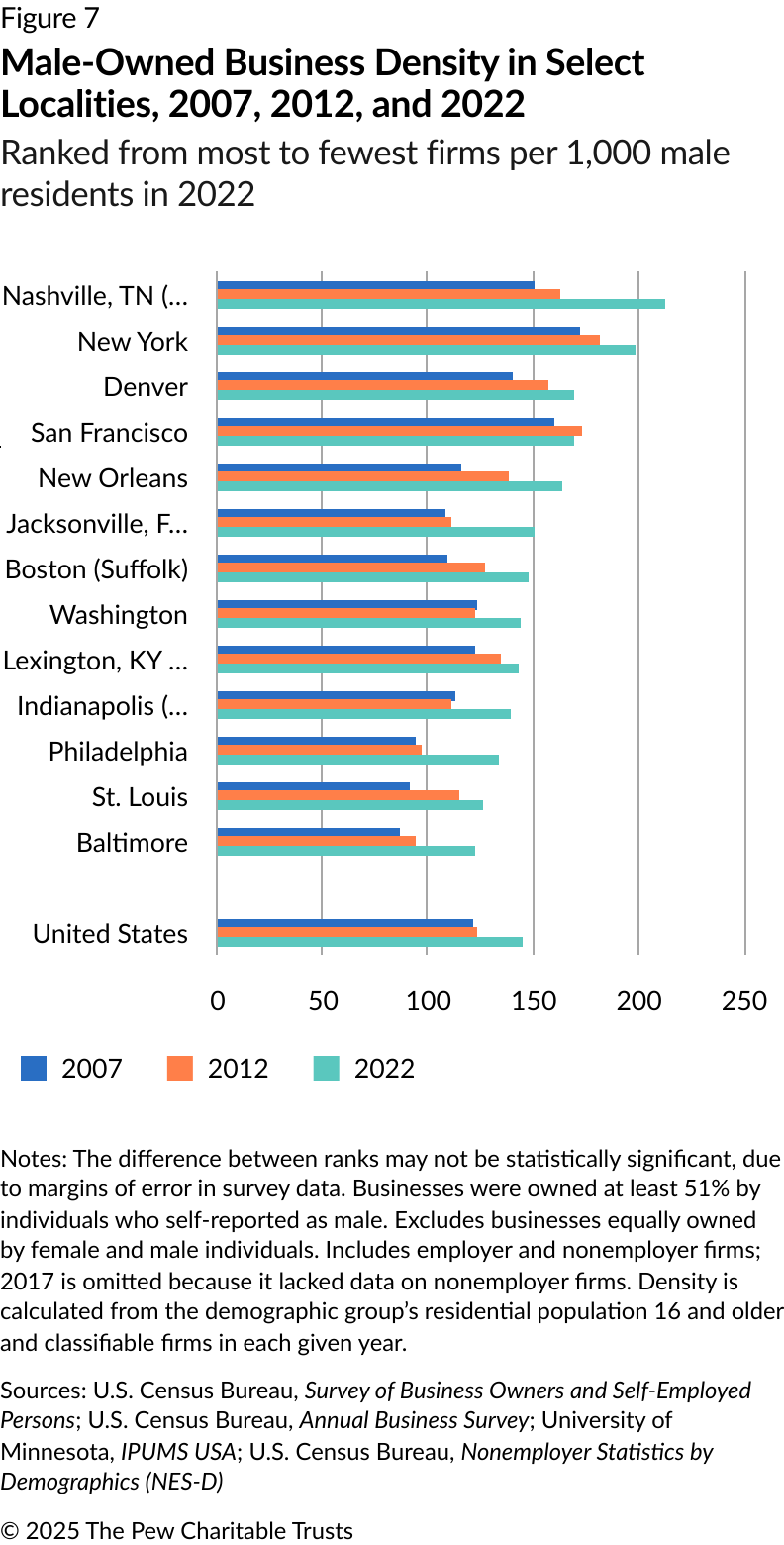 Male-owned businesses also grew slightly faster in Philadelphia than elsewhere from 2012 to 2022, but not enough to change their ranking. They reached nearly 14,440 employer businesses and 64,000 nonemployer firms in 2022. That was 56% of all businesses by biological sex, above the 46% of the 16-and-older population that men represented in Philadelphia. That gain over the decade raised business density to 133 firms per 1,000 male Philadelphians, which only slightly narrowed the gap with other localities and with the national average. (See Figure 7.)