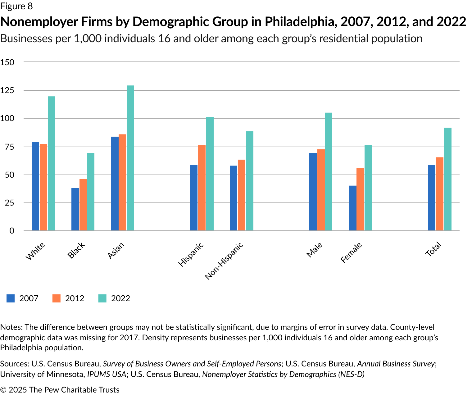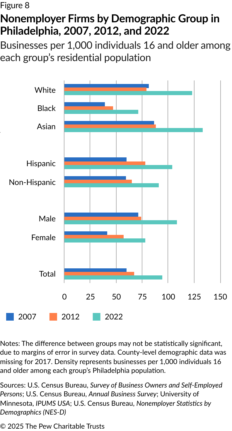 Businesses in Philadelphia without any employees—such as individual entrepreneurs, contractors, freelancers, gig workers, and various types of holding companies—drove most of the growth in business ownership by each demographic group from 2012 to 2022. (See Figure 8.) Job-creating firms with workers, meanwhile, grew just slightly over the period.