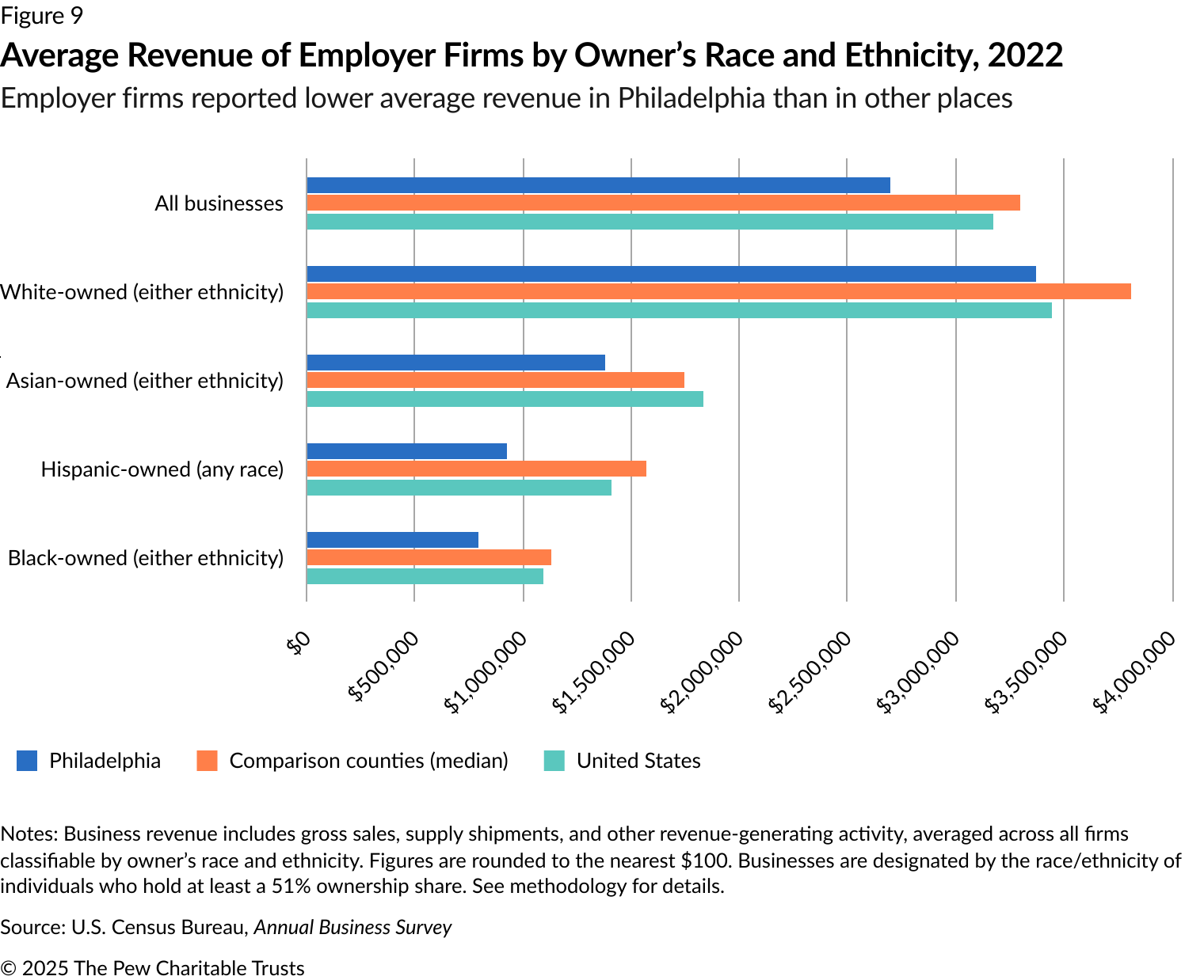 The revenue that businesses generated for their owners also differed starkly between groups and from one locality to another. For instance, in 2022, Philadelphia’s 1,990 Black-owned employer businesses reported an average of $792,500 in gross revenue from sales and other activities, 30% below the median of their peers in the comparison localities. The city’s 1,000 Hispanic-owned employer businesses reported an average $921,100 in gross revenue, which was 41% below the median of their peers. Philadelphia’s Asian-owned businesses reported 21% less revenue and White-owned businesses 12% less, on average, than their peers elsewhere. (See Figure 9.)