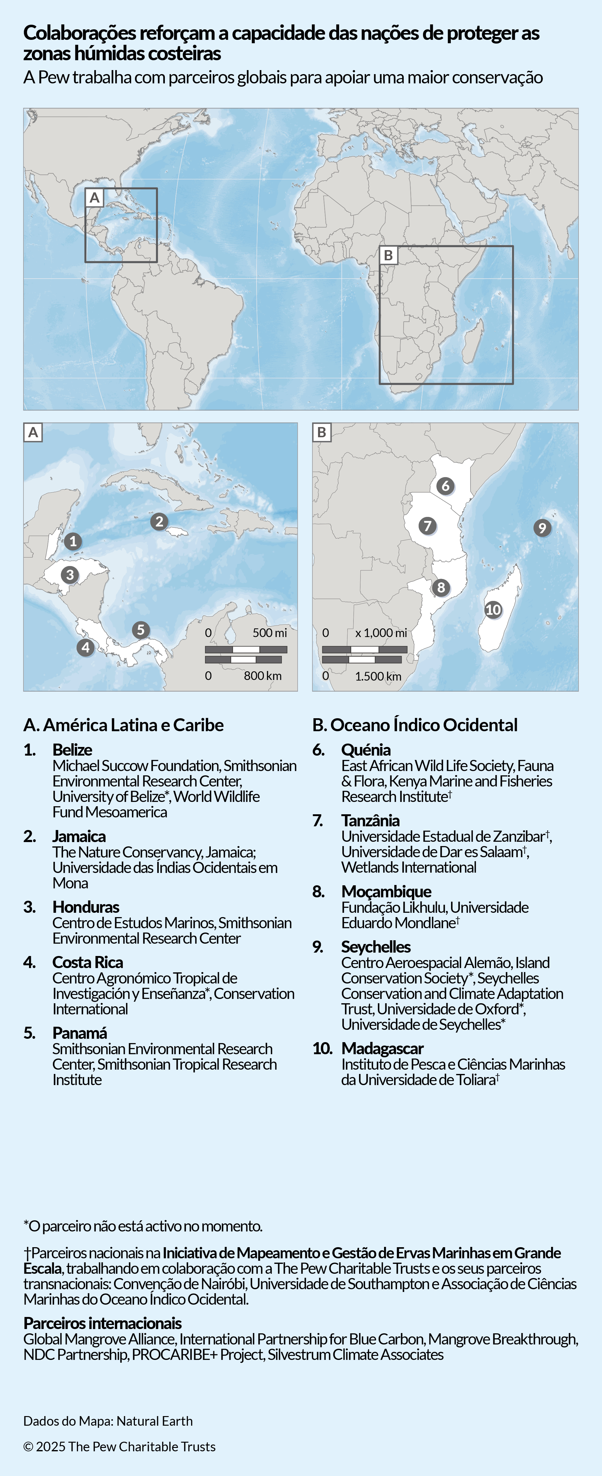 O projecto de conservação de zonas húmidas costeiras do Fundo de Caridade Pew está actualmente envolvido em nove países em duas regiões geográficas - América Latina e Caribe, e oeste do Oceano Índico. O objectivo é apoiar esses países na elaboração e implementação de contribuições nacionalmente determinadas (NDCs) robustas, ao abrigo do Acordo de Paris, que protejam ou restaurem as suas zonas húmidas costeiras. Por meio de parcerias com instituições de pesquisa locais e regionais, universidades, organizações não governamentais, bem como com todos os níveis de governo, a Pew trabalha para fortalecer a capacidade de pesquisa, política e financeira destes países para conservar os ecossistemas costeiros de zonas húmidas, incluindo mangais, ervas marinhas e pântanos salgados.