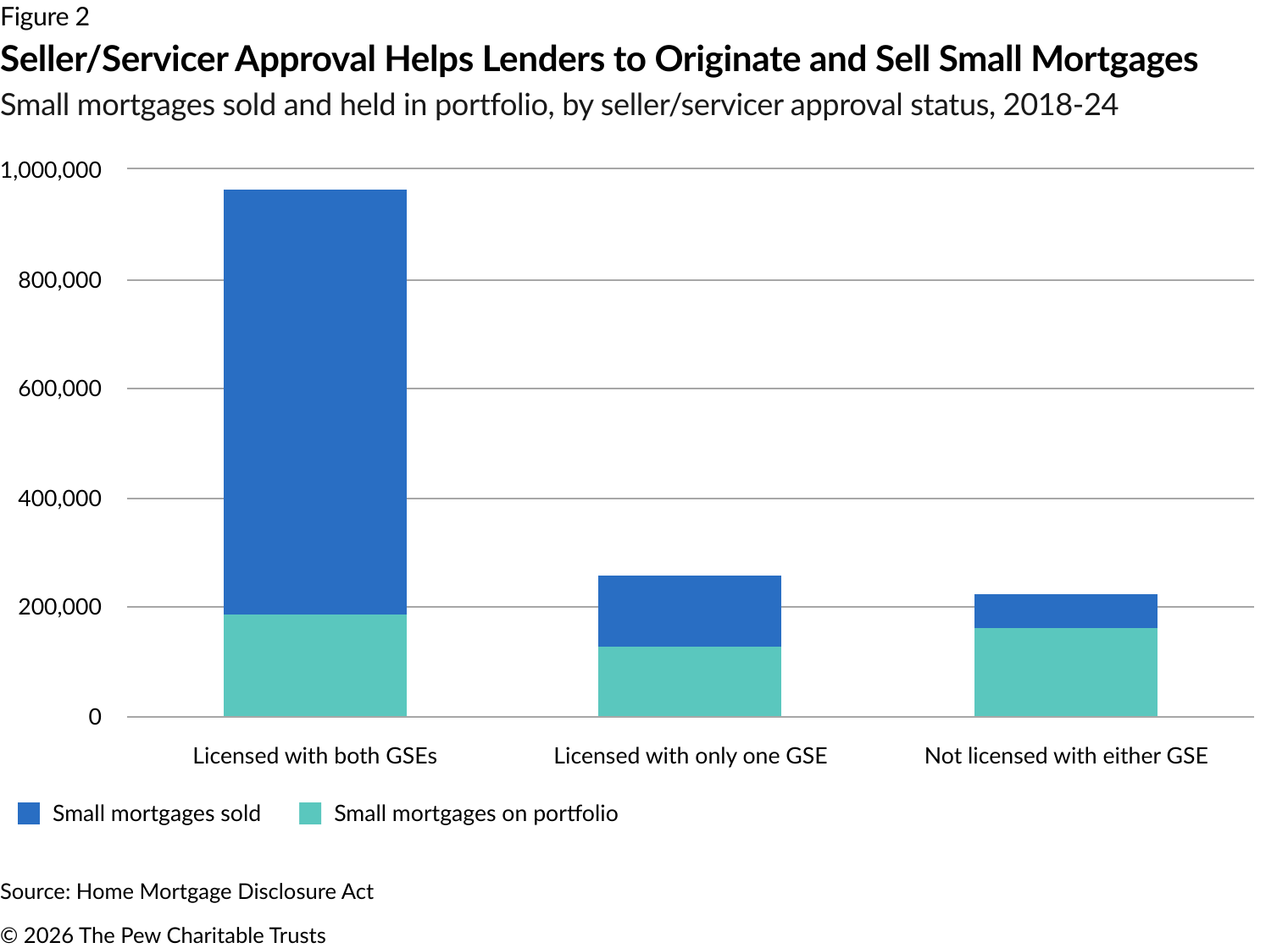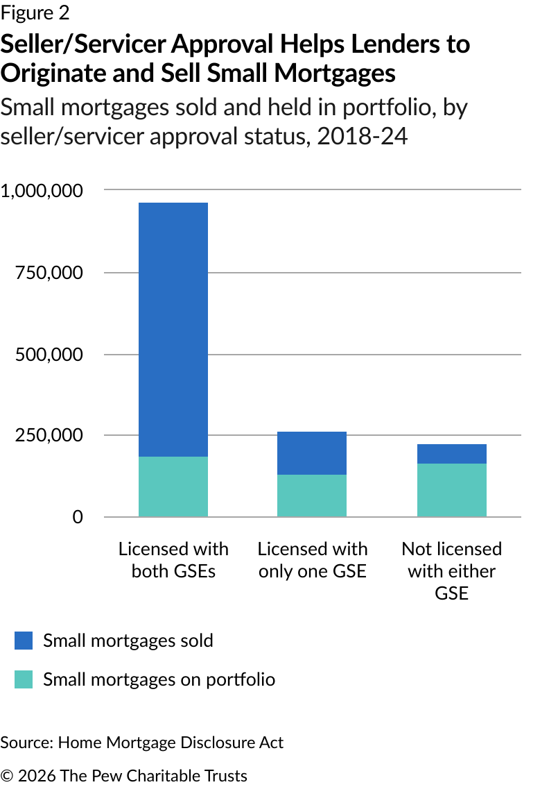 Sometimes, lenders hold loans in their portfolios because they don’t conform to federal standards and are therefore ineligible to be sold to Fannie Mae and Freddie Mac. However, The Pew Charitable Trusts’ research found that 182,000 of the 475,000 small mortgages held in the original lenders’ portfolios between 2018 and 2024 were underwritten using Desktop Underwriter or Loan Product Advisor, the automated underwriting systems offered by Fannie Mae and Freddie Mac. This finding suggests that more than a third of the small mortgages held in lenders’ portfolios already meet the GSEs’ underwriting standards and are therefore eligible for purchase.