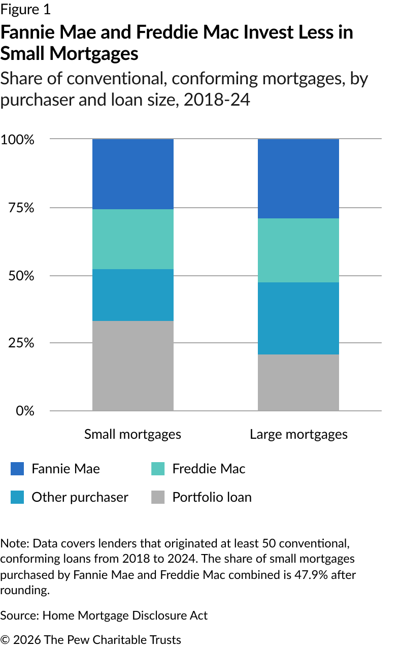 Small mortgages are vital to affordable homeownership in much of the United States, but they are underserved by the secondary mortgage market. Fannie Mae and Freddie Mac excel at purchasing larger mortgages but have historically purchased a lesser share of small mortgages, with the shortfall reaching over 70,000 loans and $6.7 billion between 2018 and 2024. The lack of GSE investment has reduced financial incentives for lenders to issue small mortgages and limited borrowers’ access to safe and affordable financing.